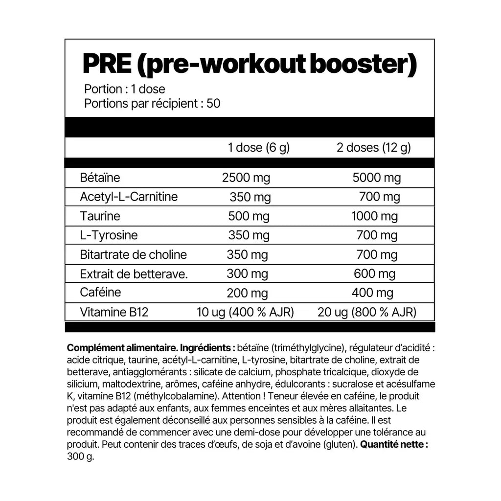 Complément alimentaire. Ingrédients : bétaïne (triméthylglycine), régulateur d’acidité : acide citrique, taurine, acétyl-L-carnitine, L-tyrosine, bitartrate de choline, extrait de betterave, antiagglomérants : silicate de calcium, phosphate tricalcique, dioxyde de silicium, maltodextrine, arômes, caféine anhydre, édulcorants : sucralose et acésulfame K, vitamine B12 (méthylcobalamine). Attention ! Teneur élevée en caféine, le produit n'est pas adapté aux enfants, aux femmes enceintes et aux mères allaitantes. Le produit est également déconseillé aux personnes sensibles à la caféine. Il est recommandé de commencer avec une demi-dose pour développer une tolérance au produit. Peut contenir des traces d’œufs, de soja et d’avoine (gluten). Quantité nette : 300 g.